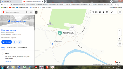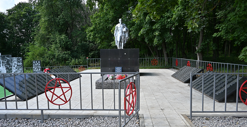 Краткое описание памятника(надгробия), захоронения: Братская могила, ограждение металлическое 12,5*20 м, гробница 2,5*1,5м из габиона, постамент со скульптурой солдата, в правой руке автомат, в левой руке каска, высота 3,5 м., внизу постамента гранитная плита «В ПАМЯТЬ КОММУНИСТАМ РОЖКОВУ ФЕДОРУ ИВАНОВИЧУ, ВАСИНОЙ ИРИНЕ ИВАНОВНЕ И ДРУГИМ ЖИТЕЛЯМ, ЗАМУЧЕННЫМ ФАШИСТАМИ В ГОДЫ ОККУПАЦИИ». По обе стороны 20 гранитных плит с именами погибших воинов. Слева от постамента гранитная композиция (гранитная плита1,40 м*,70 м на подставке, лицевая часть гравировка изображения с миниатюр 16 погибших, , тыльная сторона Фамилия Имя Отчество, дата рождения) Далее конструкция из 3 стел (изображение «Знамя Победы над рейхстагом),портретные изображения 2 погибших на гранитных плитах 60*30 ,якорь, портретное изображение погибшего на гранитной плите 80*50.