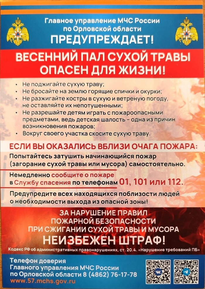 Сотрудники пожарной охраны Орловской области предупреждают: маленький костер может стать причиной большой беды. Не всегда весеннее сжигание травы и мусора близ домов проходит бесследно. Зарегистрированы случаи, когда от такого огня горят хозяйственные постройки и жилые дома. Сезон массовых травяных палов начинается с момента схода снега и высыхания прошлогодней травы на открытых участках и заканчивается временем активного роста молодой зелени, то есть продолжается три-четыре недели. За это короткое время травяные палы охватывают огромные площади.