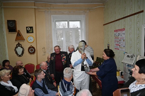 Надежда Витальевна Юркова, главный специалист краеведческого музея, дополнившая рассказ о катастрофе. Она предложила школьникам наглядно познакомиться с историей, примерив элементы специальной защитной одежды ликвидаторов.