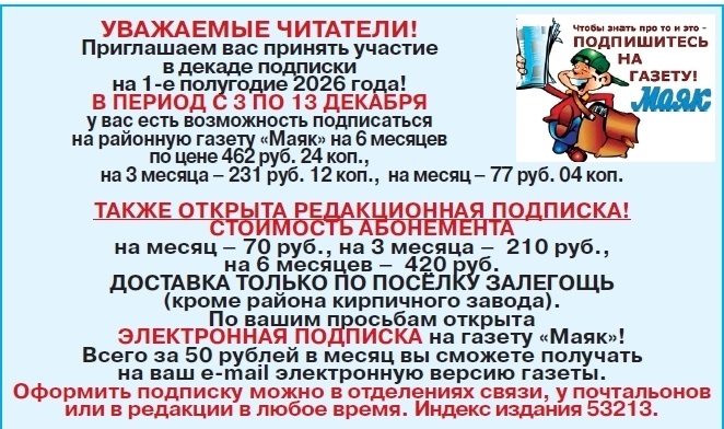 С 3 по 13 декабря 2025 года проходит традиционная декада подписки на районную газету "Маяк" на 1-е полугодие 2026 года.