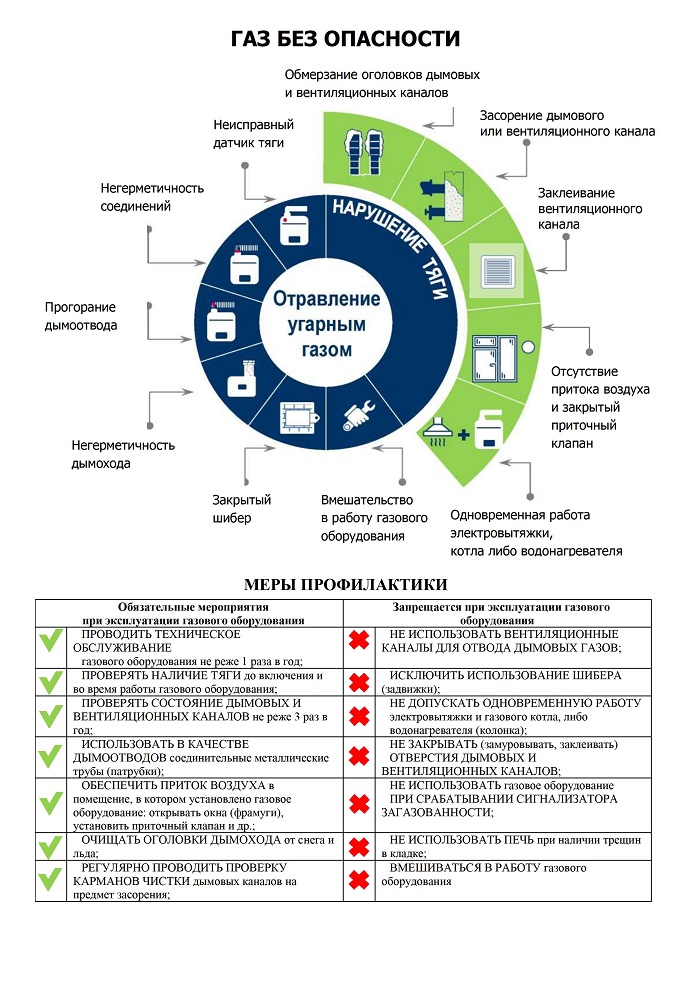 Отсутствие тяги в дымоходе или вентиляционном канале, закрытый шибер печи, нарушение правил эксплуатации бытового газоиспользующего оборудования – это наиболее частые причины происшествий в жилом фонде, связанных с газом.