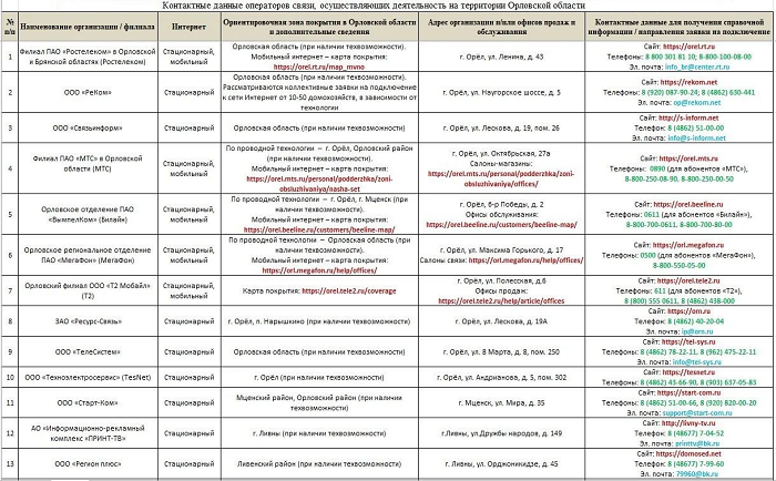 Операторы связи, работающие в регионе и предоставляющие услуги широкополосного доступа в Интернет: