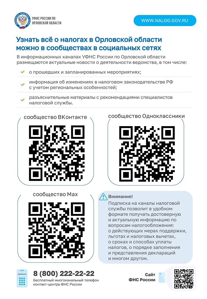 Сайт ФНС России: Главный источник всей информации. Социальные сети: Официальные группы во ВКонтакте и Одноклассниках. Мессенджер: канал в национальном мессенджере МАХ.